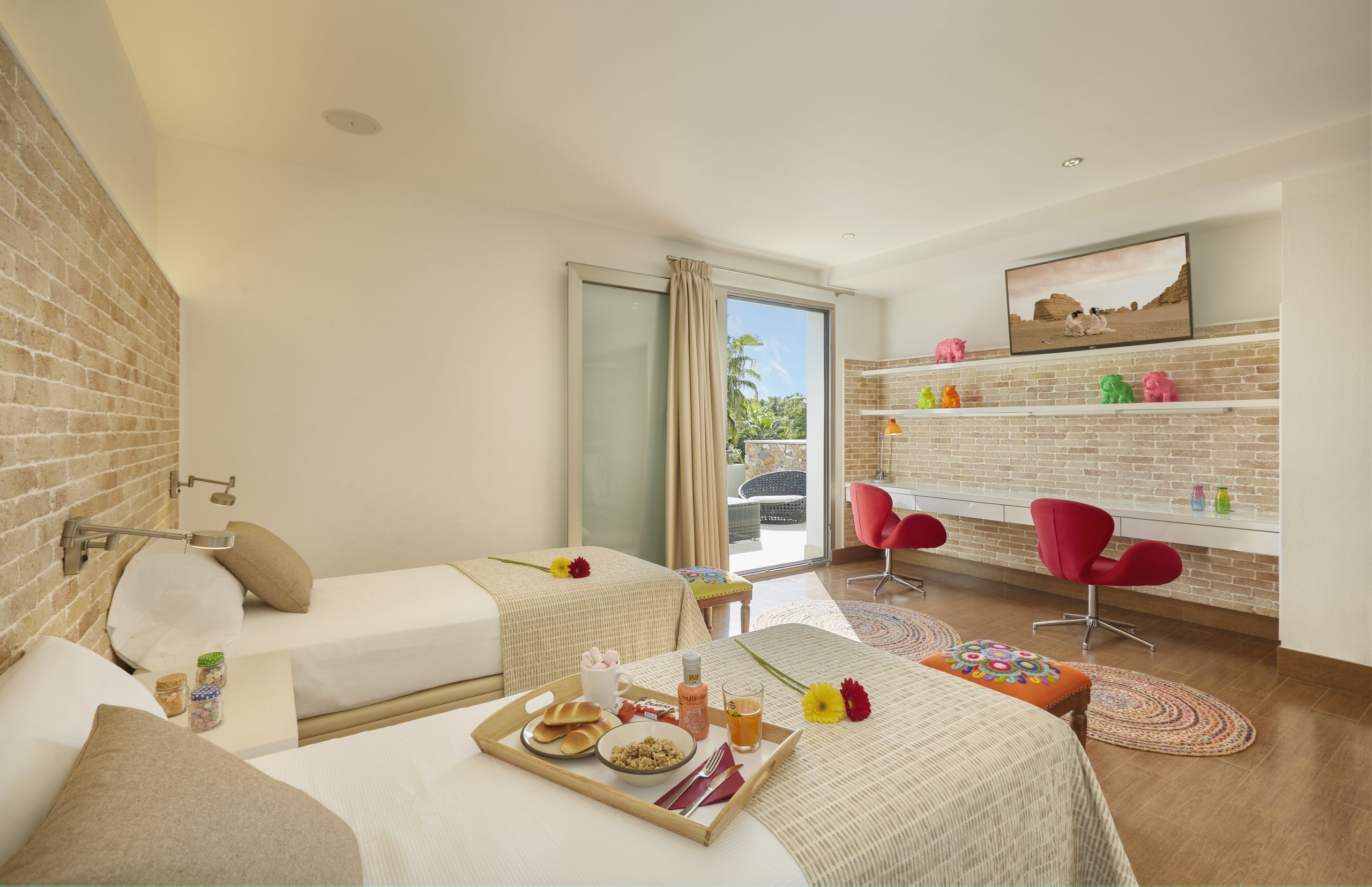 modern living room, a fully equipped kitchen and two bedrooms with